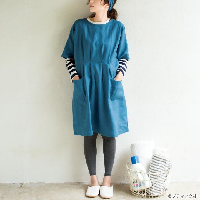 ひざ上丈なので、レギンスやパンツとの重ね着を楽しんで。