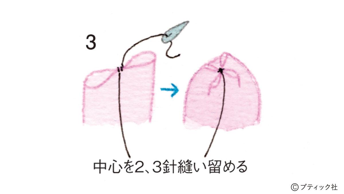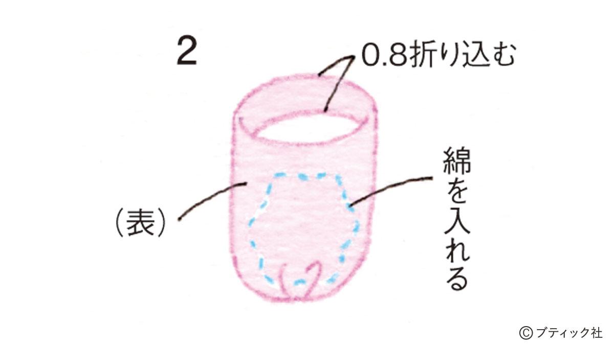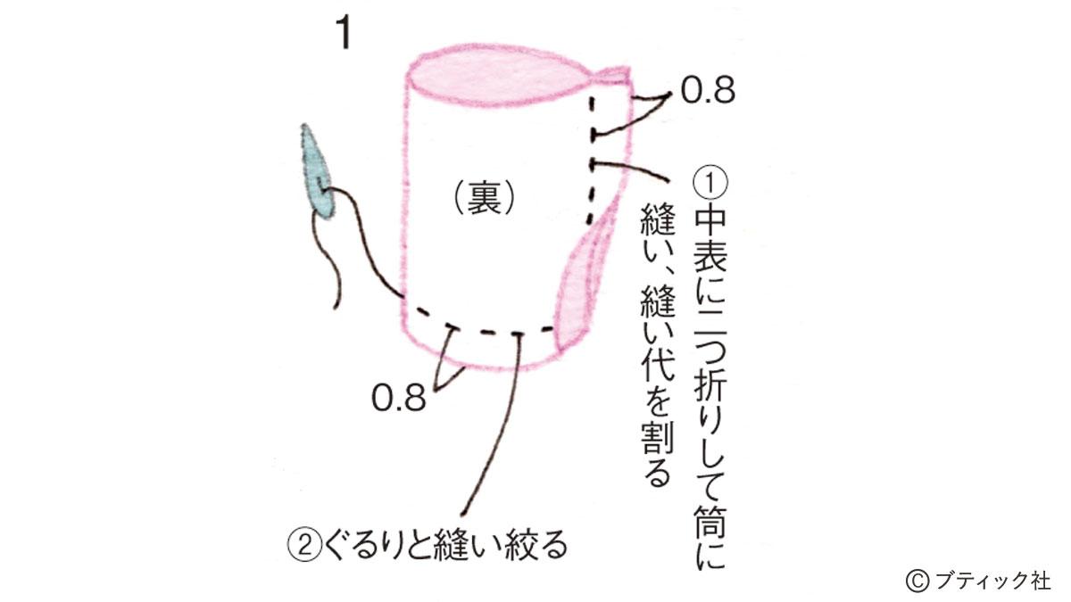 1. ①中表に二つ折りにして筒に縫い、縫い代を割る。 ②ぐるりと縫い絞る。