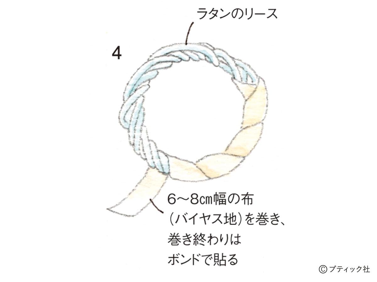 4.6~8cm幅の布(バイヤス地)を巻き、巻き終わりはボンドで貼る。