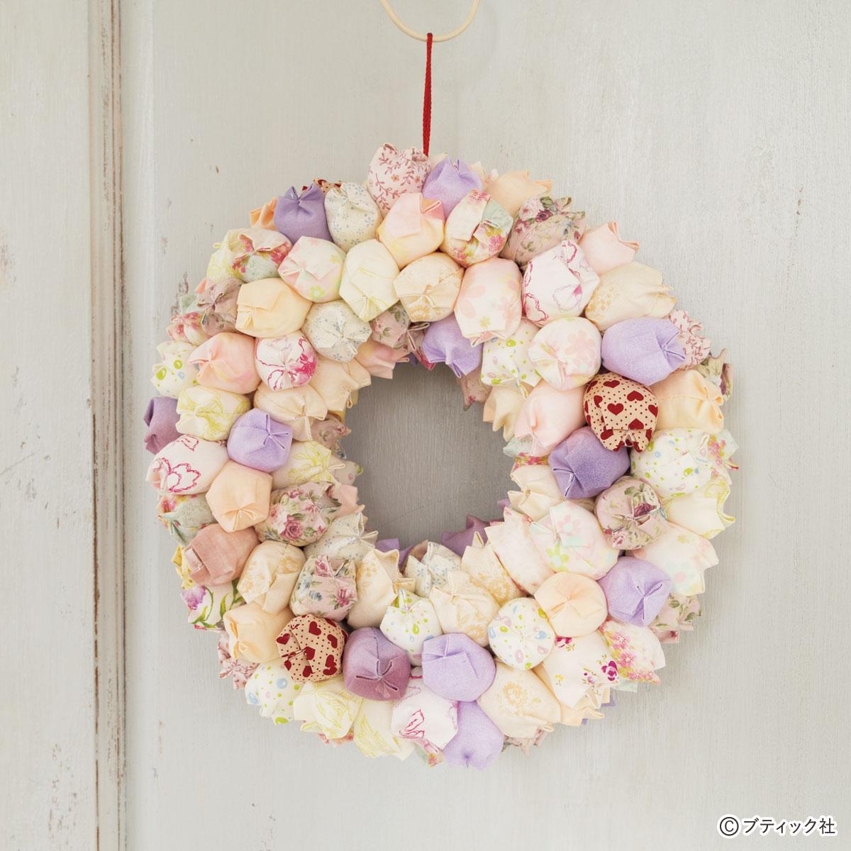いますぐ部屋に飾りたくなる、パッチワークのおすすめのレシピがこちら!ふっくらした花を隙き間なく付けてボリュームのある仕上がりにしたリースです。淡いピンクを中心にして紫やグリーンなどをところどころに混ぜ、ふんわりした色合いに♪