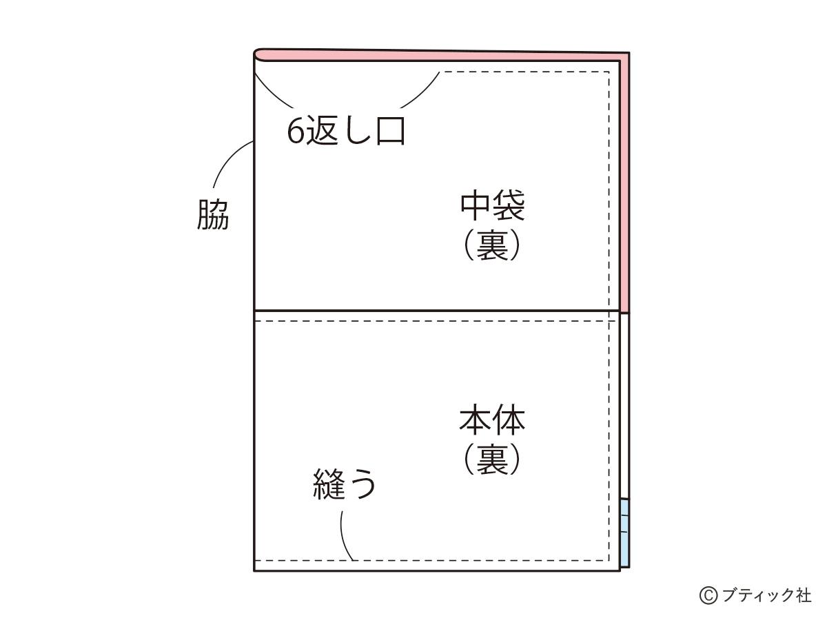 02 01を開いて脇から中表に折り、返し口を残して3辺を縫う