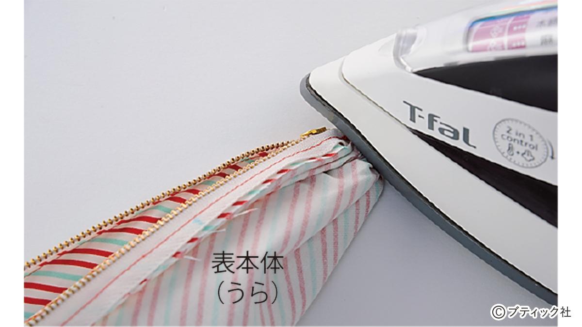 03 2で折った両端を、ファスナーと表本体の中心を合わせてファスナーの上にのせ、ミシンで縫う。