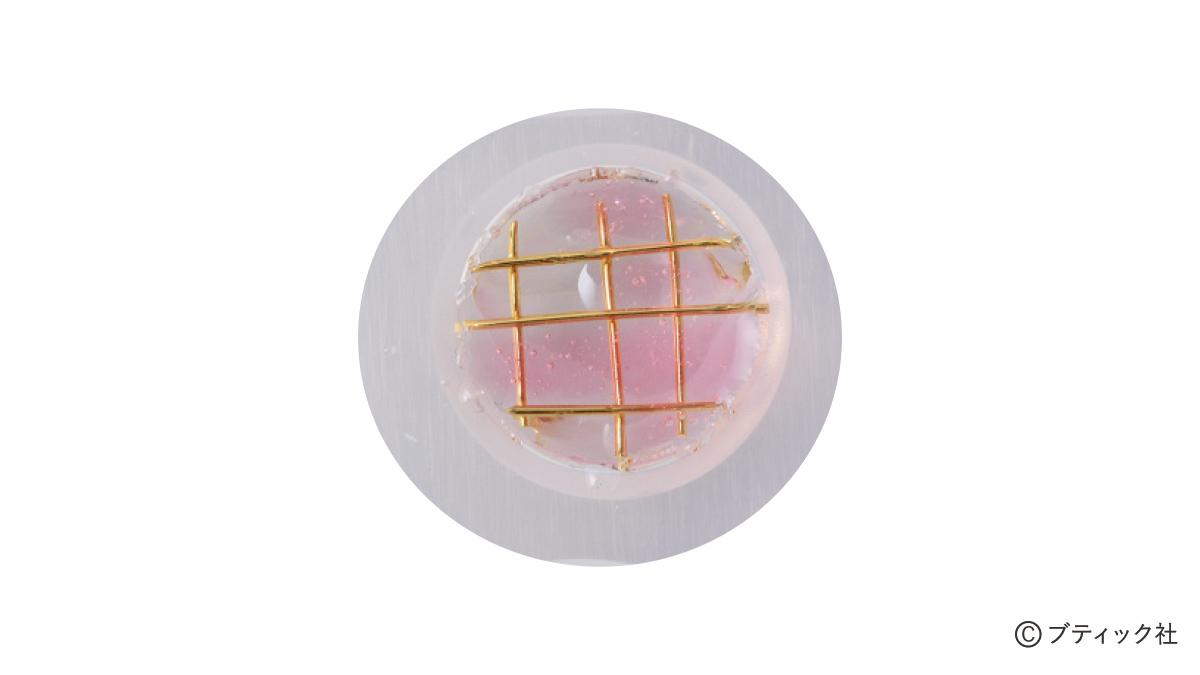 09 メインで見せたい色から着色レジンをのせていきます。着色レジン(ピンク)をつまようじで取り、色をつけたい列全体にのばします。UVライトを30秒照射して硬化させます。