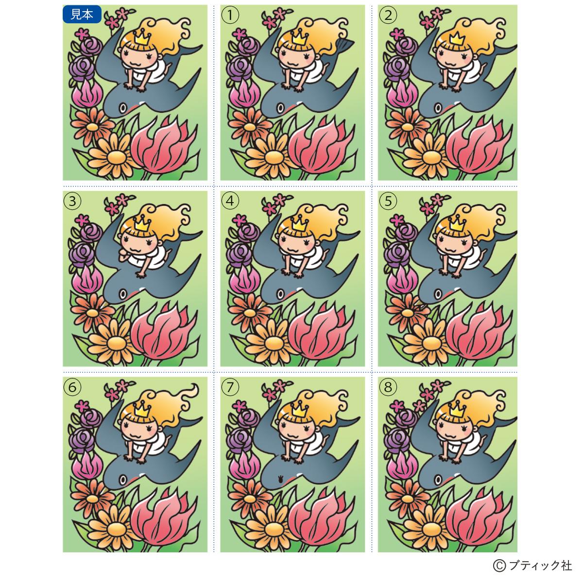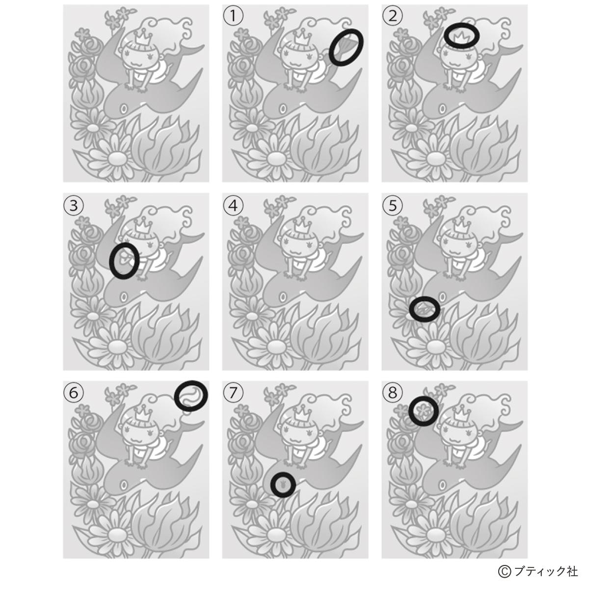 ①から⑧の中から、左上の見本とまったく同じイラストを1つ探してください。さて、それは何番でしょうか。○をつけましょう。