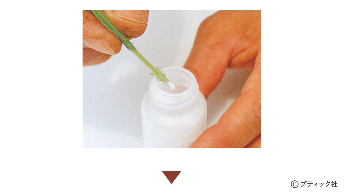 若い枝を長さ20cmぐらいに切って水につけておき、土にさすところを斜めに切り、発根剤につけます。深さ3cmぐらいの穴をあけ、さし穂をさします。