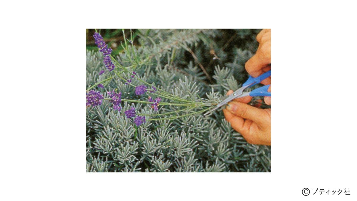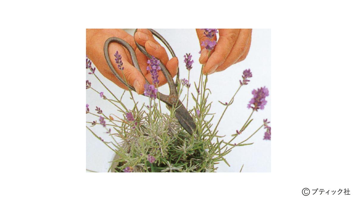 花が咲き終わった状態(花後)。花穂の下で切ります。切ったものは乾燥保存して利用しましょう。