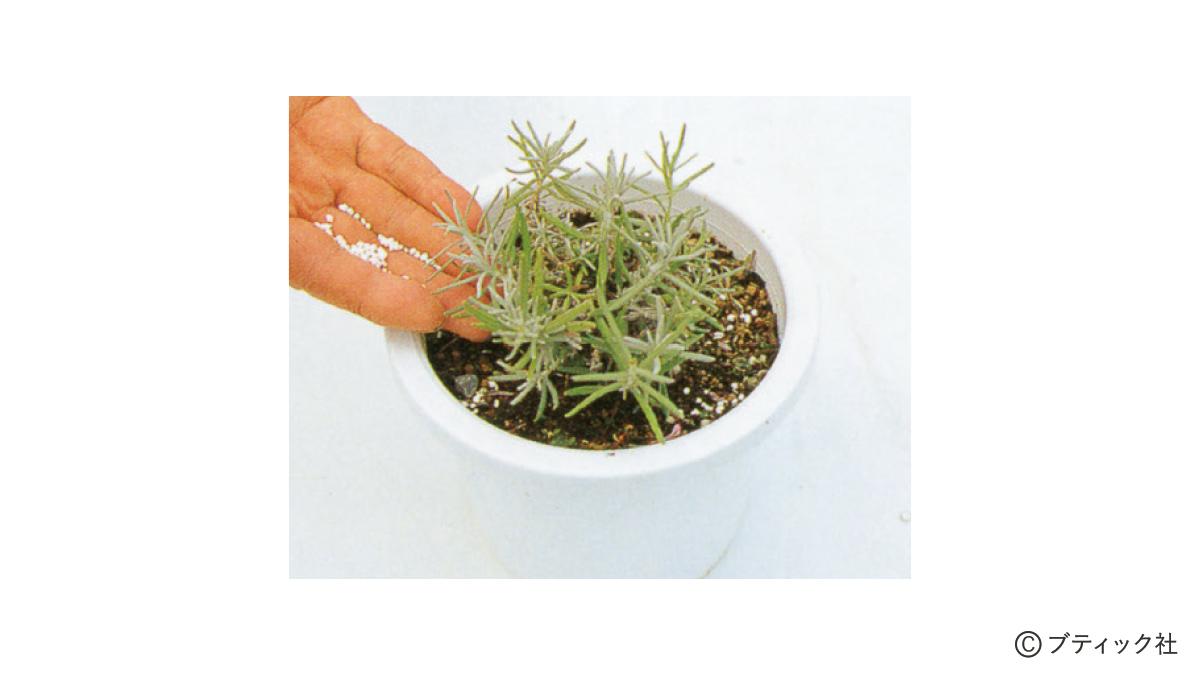 切り戻したら、固形肥料で追肥します。根を痛めないように、根から少し離れたところにまきましょう。