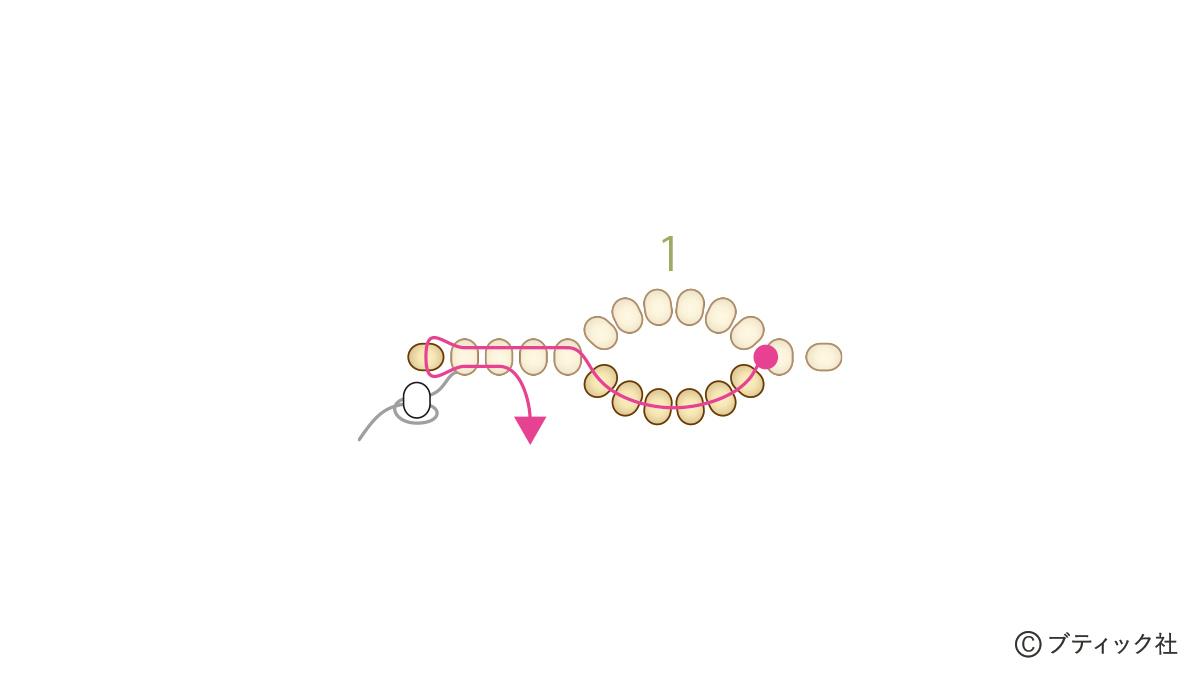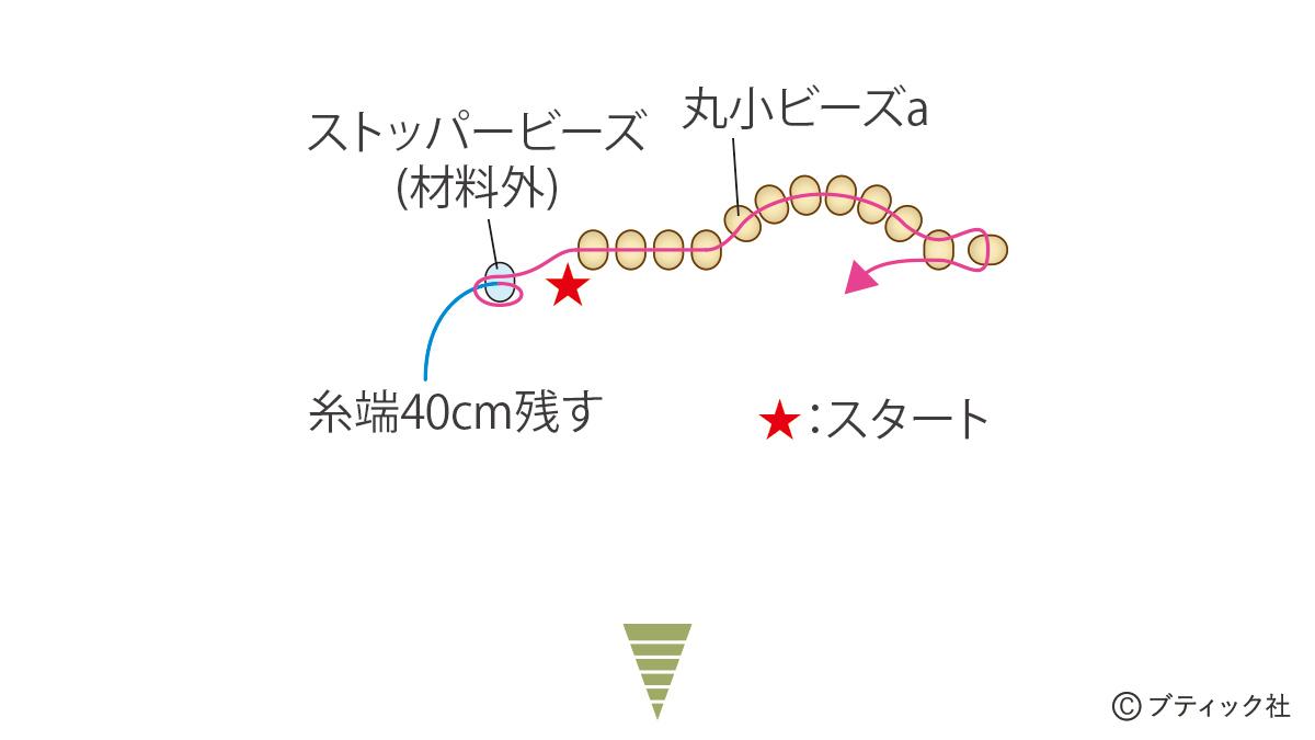 01 糸を2.4mに切り、糸端40cm残してストッパービーズをつける。丸小ビーズaの葉を作る。