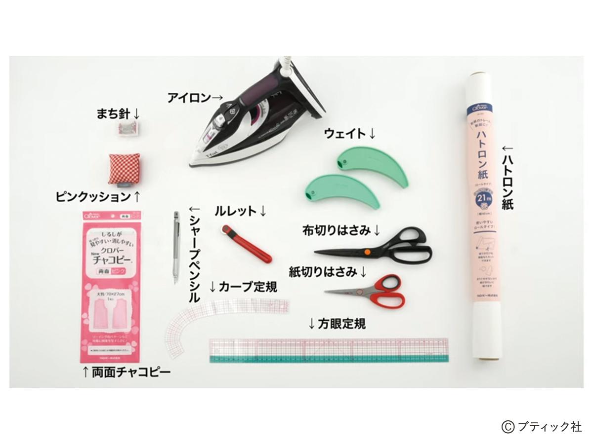 右からハトロン紙、ウェイト、布切りはさみ、紙切りはさみ、方眼定規、アイロン、ルレット、シャープペンシル、カーブ定規、まち針、ピンクッション、両面チャコピーです。