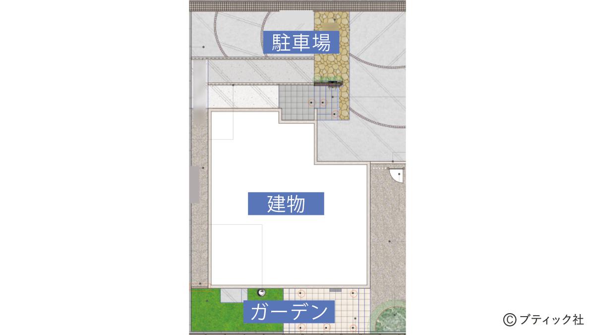 ナチュラルモダンな建物に合わせた新築外構のご依頼をいただきました。土間をコンクリートで舗装して、2台分の駐車スペースを確保しました。アプローチにはスタンプコンクリートを使用し、単調にならない工夫をしています。アプローチの存在を明確にしつつ、デザイン性もプラスしています。