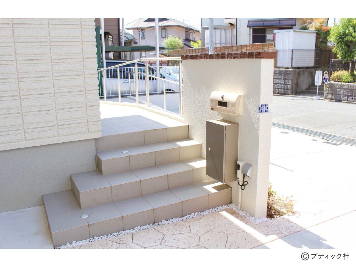 ①玄関ポーチとアプローチ階段はナチュラルカラーのタイル貼り。
