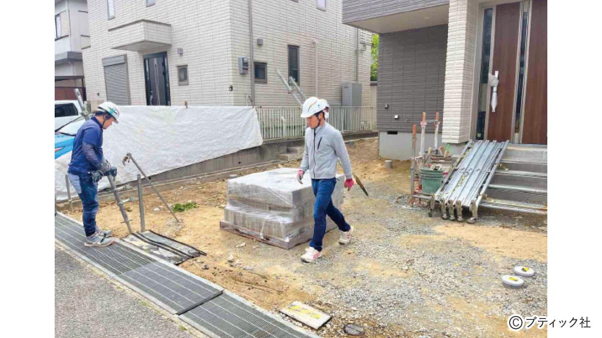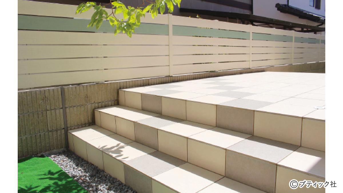 ⑤⑥お庭には、リビングからつながるようにタイルテラスを造作しました。テラスの左右にステップがあるため、動線も快適。