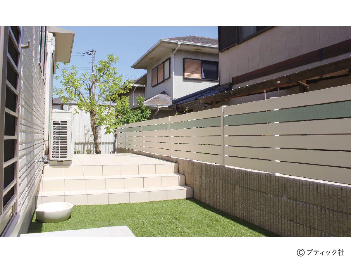 お庭には、リビングの高さに合わせたタイルテラスを施工。室内とお庭をフラットに出入りすることが可能になりました。テラスの左右にはステップを設けて、その下はお手入れのしやすい人工芝で仕上げています。