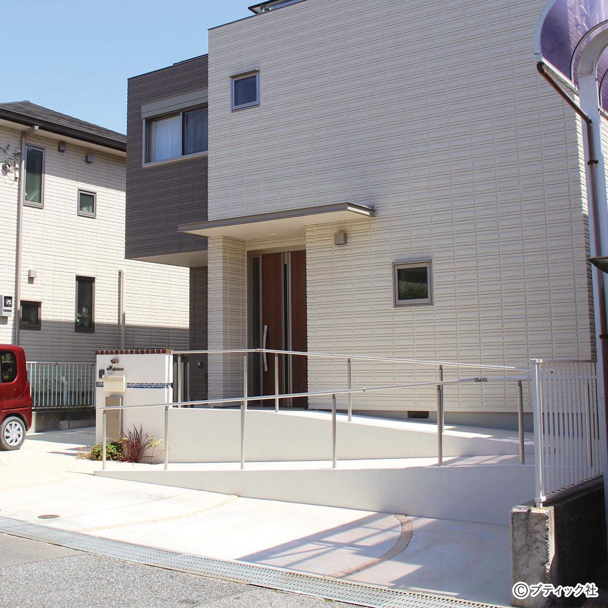 玄関ポーチとアプローチの階段はタイル貼り。階段には照明を埋め込むことで、夜間の往来にも配慮しています。建物右側にはスロープを設置。建物に対して平行に動線をとることで緩やかな勾配を実現し、手すりを取りつけることでより一層安全面に配慮しています。