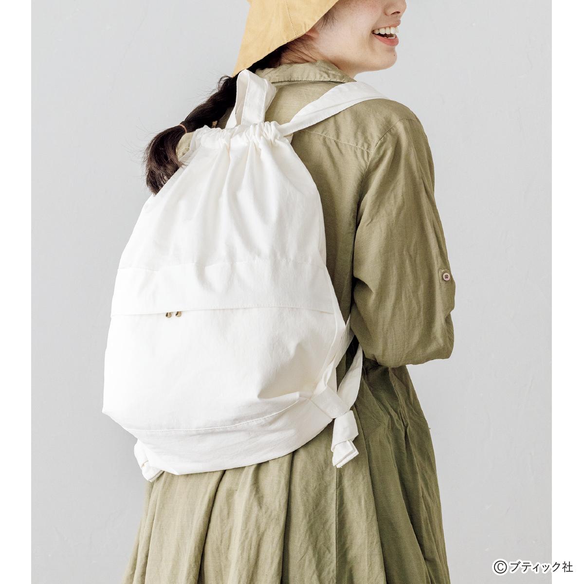 肩ひもは、使う人に合わせて結び目の位置で調節できるタイプ。