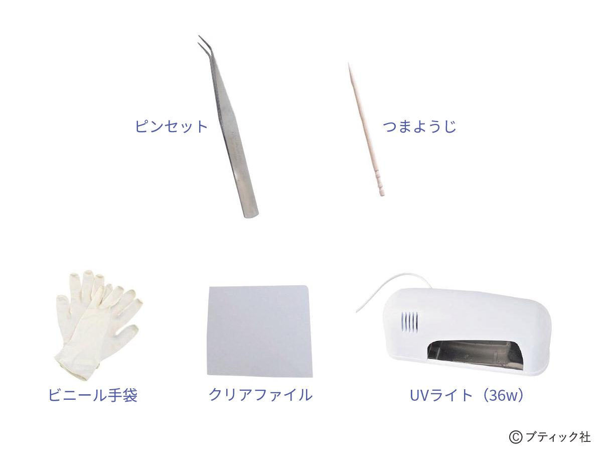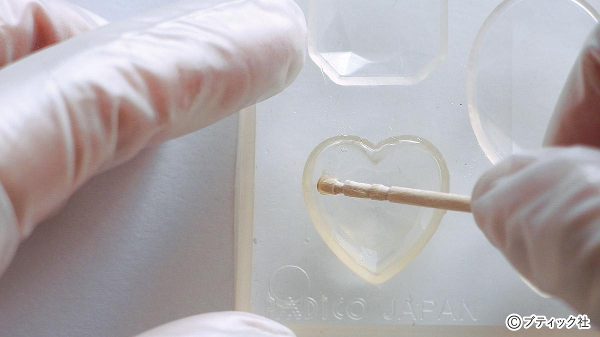 レジン液が手につくと落ちにくいため、ビニール手袋をはめて作業をするのがおすすめ。
