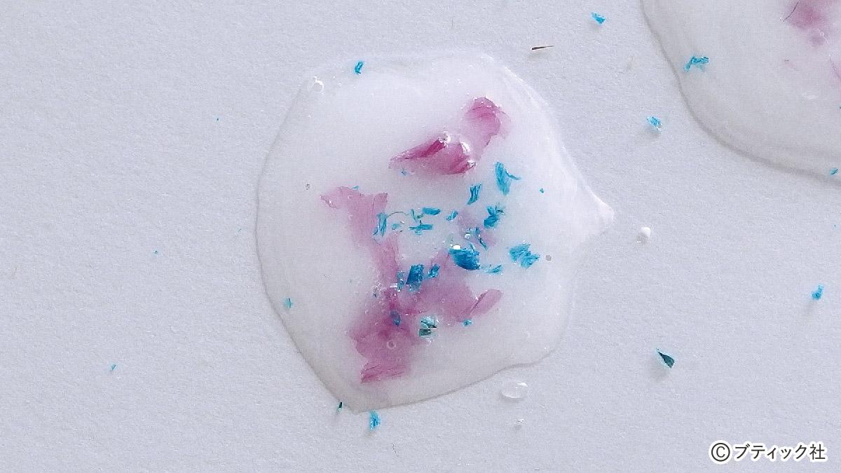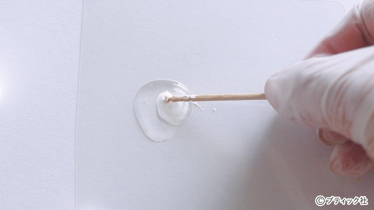 5 白い顔料を入れます。つまようじの頭でひとすくいくらいが目安。半透明より少し白いくらいの濃さに均等に混ぜます。