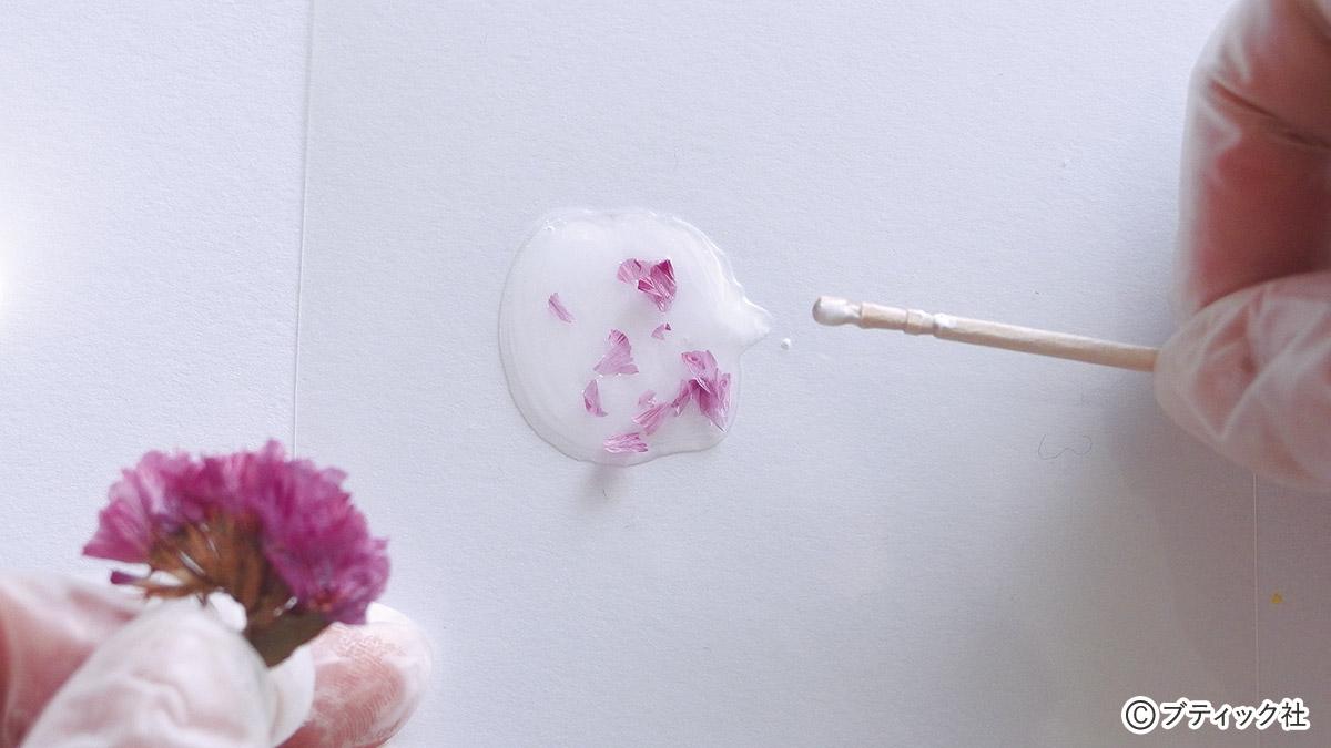 6 スターチスの花びらをレジンに入れて混ぜます。混ぜすぎると気泡ができやすくなるので、軽くなじませる程度でOK。