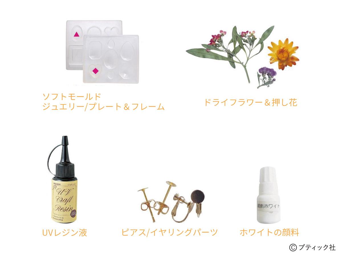ドライフラワーとUVレジンで作る!かわいい乳白色のハート型イヤリングの材料