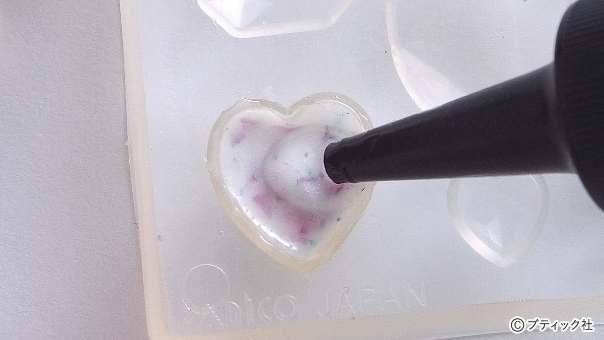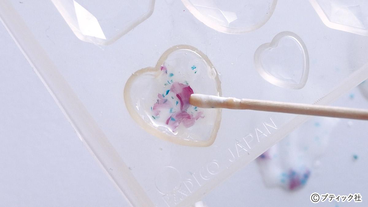 10 モールドのフチいっぱいまで、レジン液を流し込みます。
