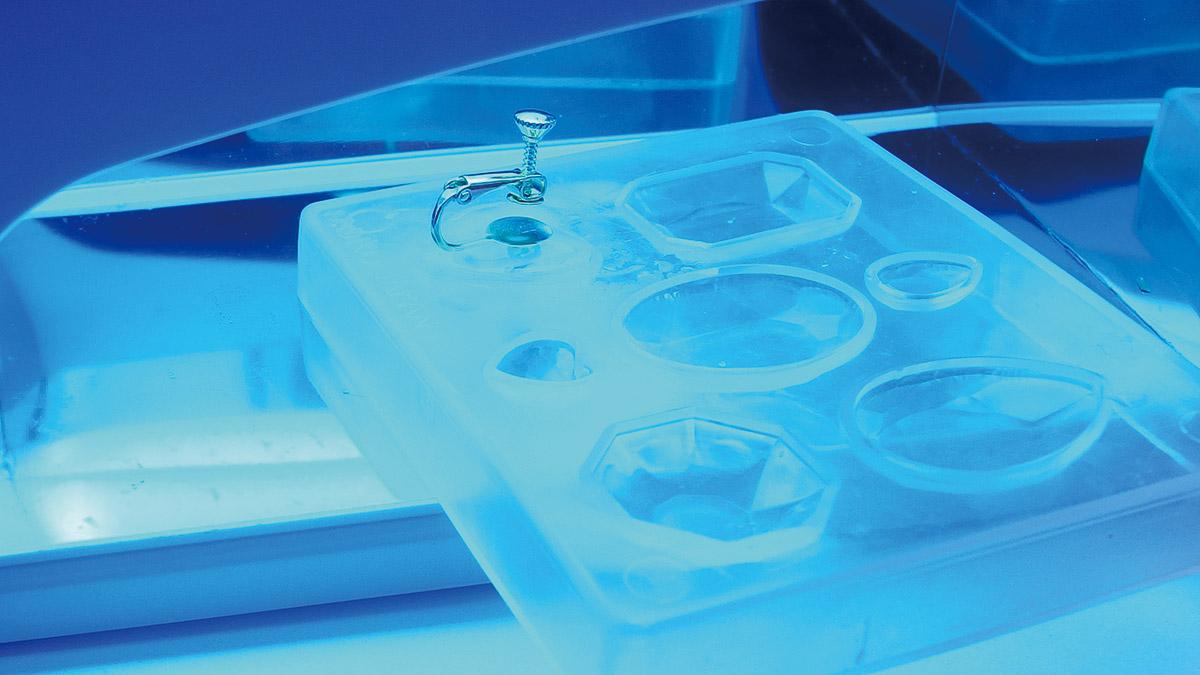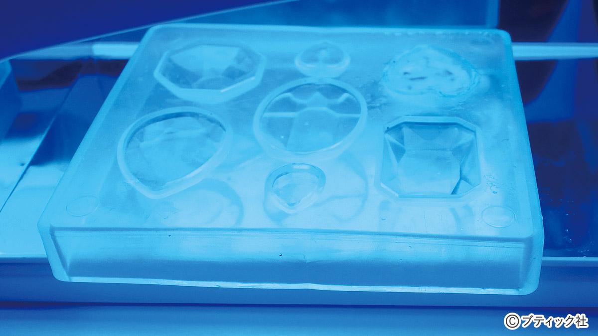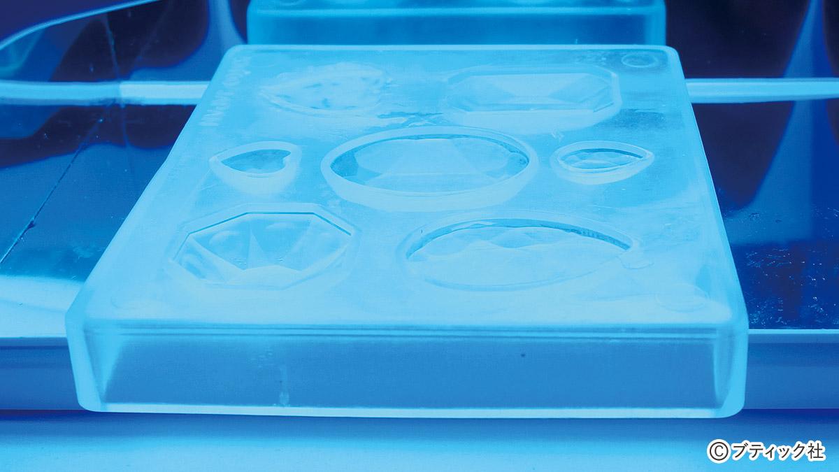 16 UVライトに入れて2分ほど照射します。モールドに入れておくと安定して全面に照射されます。