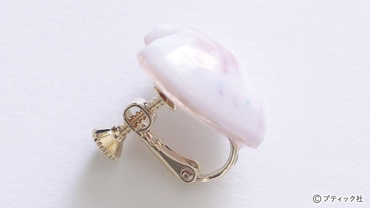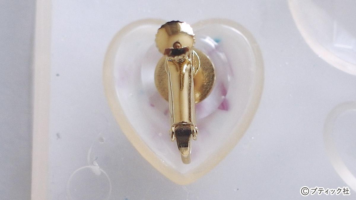 14 イヤリングパーツをつけたい場所にレジン液をのせ、丸皿でフタをするように貼りつけます。UVライトで2分ほど照射。