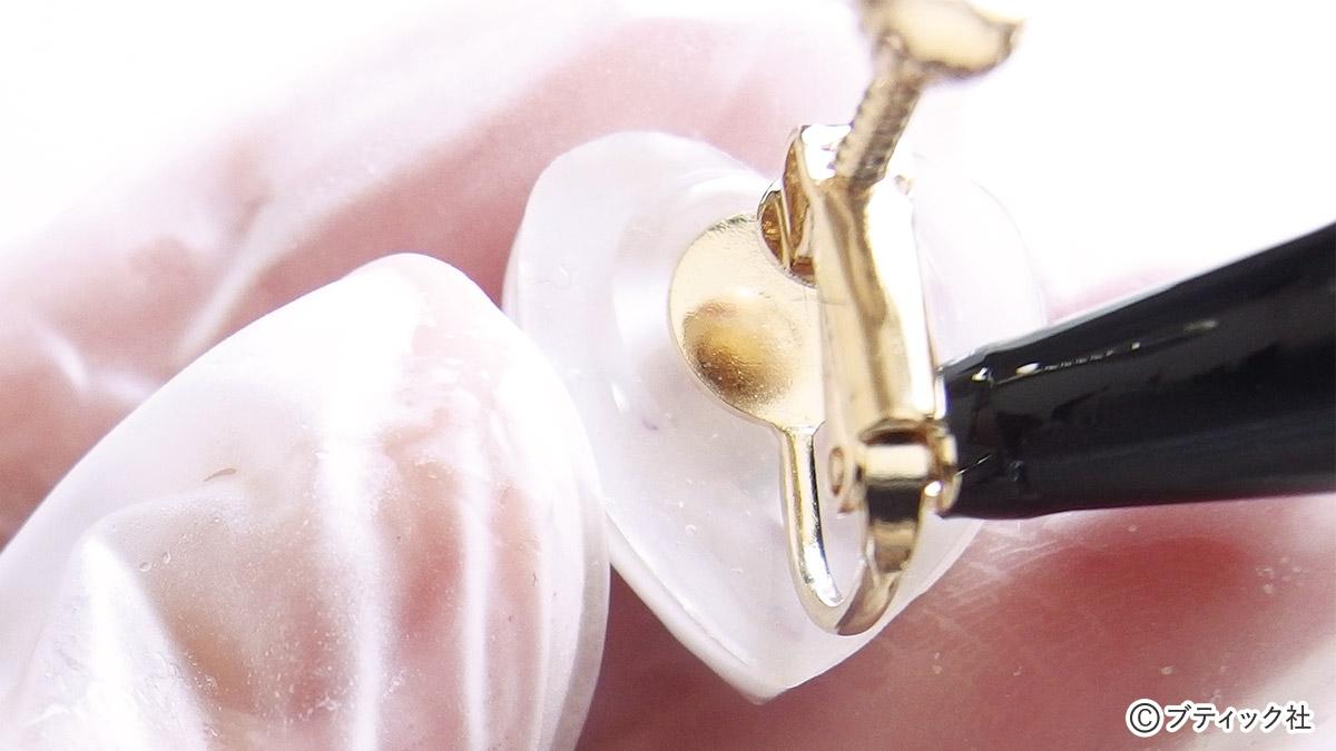 15 裏側全体に薄くレジン液を重ねます。レジンを塗り重ねることで、金具の接着強度が高まり頑丈に。