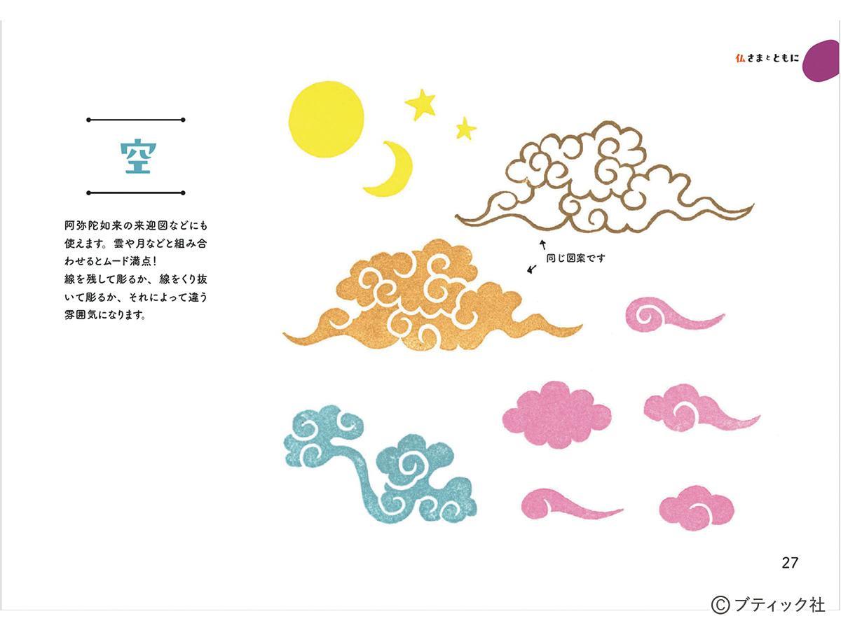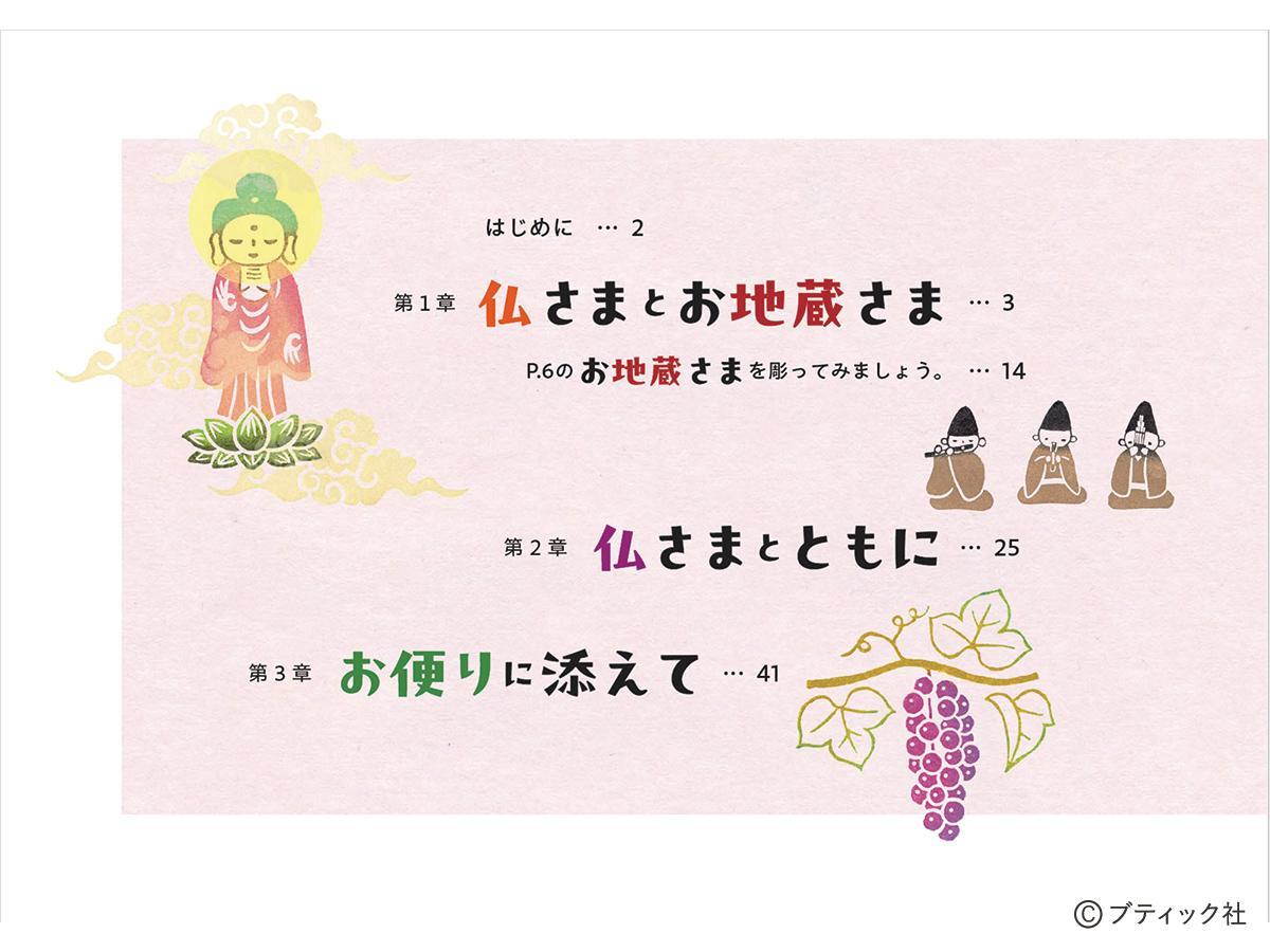 第1章ではおじぞうさまと仏さま、第2章では雲や蓮など仏さまを彩る図案、第3章では手紙などで使える図案、第4章では手帳に使える小さな図案、巻末には鳳凰や龍など、難易度高めの図案をご紹介しています。