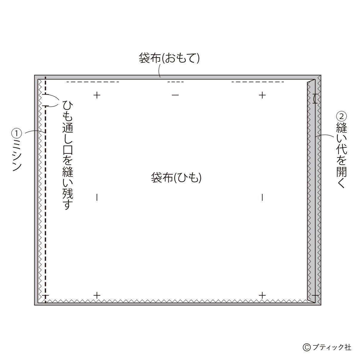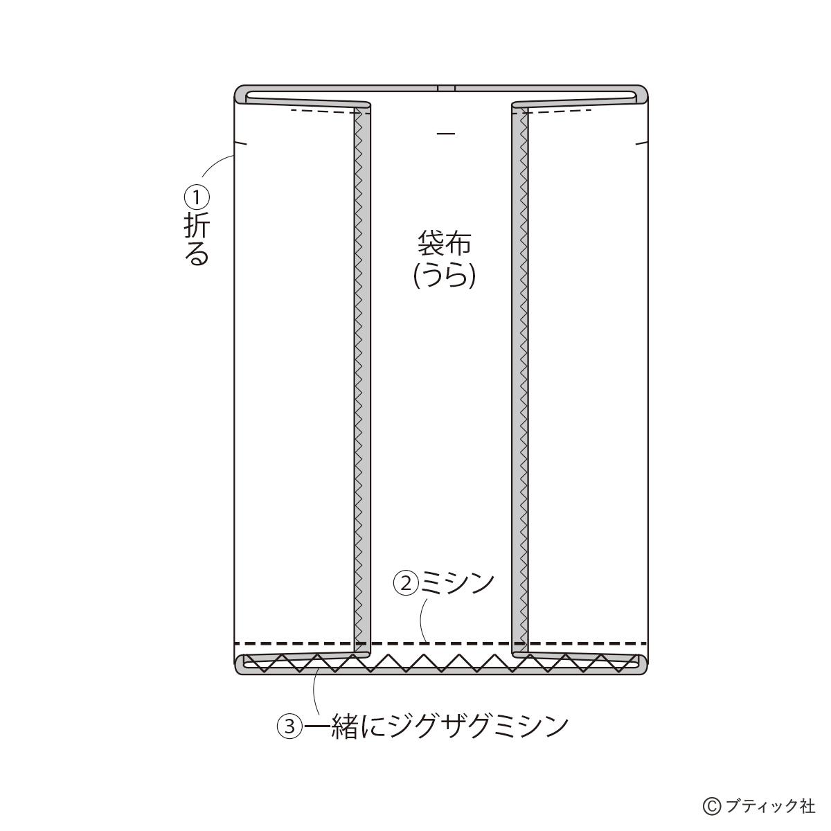 ※袋布の脇線の縫い代にジグザグミシンをかけてから縫い始めます。