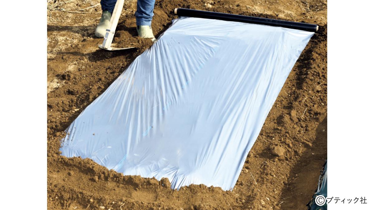 畝に黒マルチを張ると除草の手間が省け、水分も安定するので育ちがよくなります。黒マルチを利用しない場合は、ワラや刈り草、落ち葉などで畝を覆う“有機物マルチ〟を利用するといいでしょう。