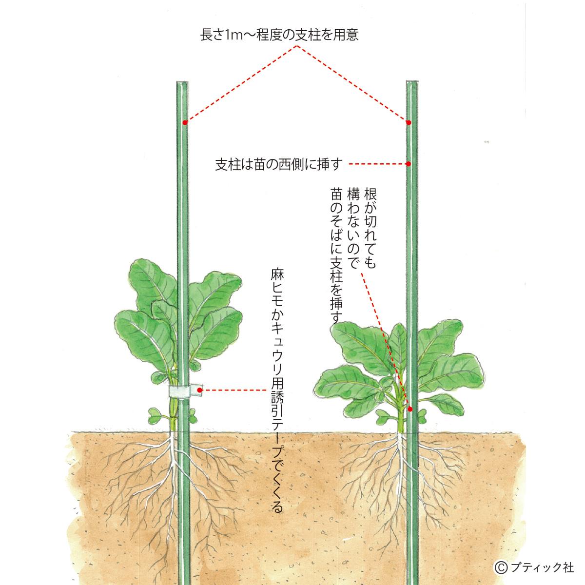 支柱を西側に立てる理由は、日が昇ったときに苗が支柱の陰に入らず、すぐに光合成を始められるからです。
