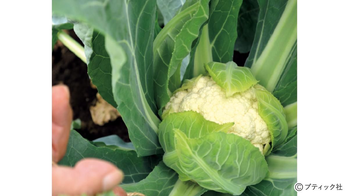 カリフラワーもブロッコリーも、葉を立てて育てると、生育が旺盛になり、しっかりと締まった形のいい大きな花蕾を収穫できます。食感も素晴らしく、野菜本来の味が楽しめます。