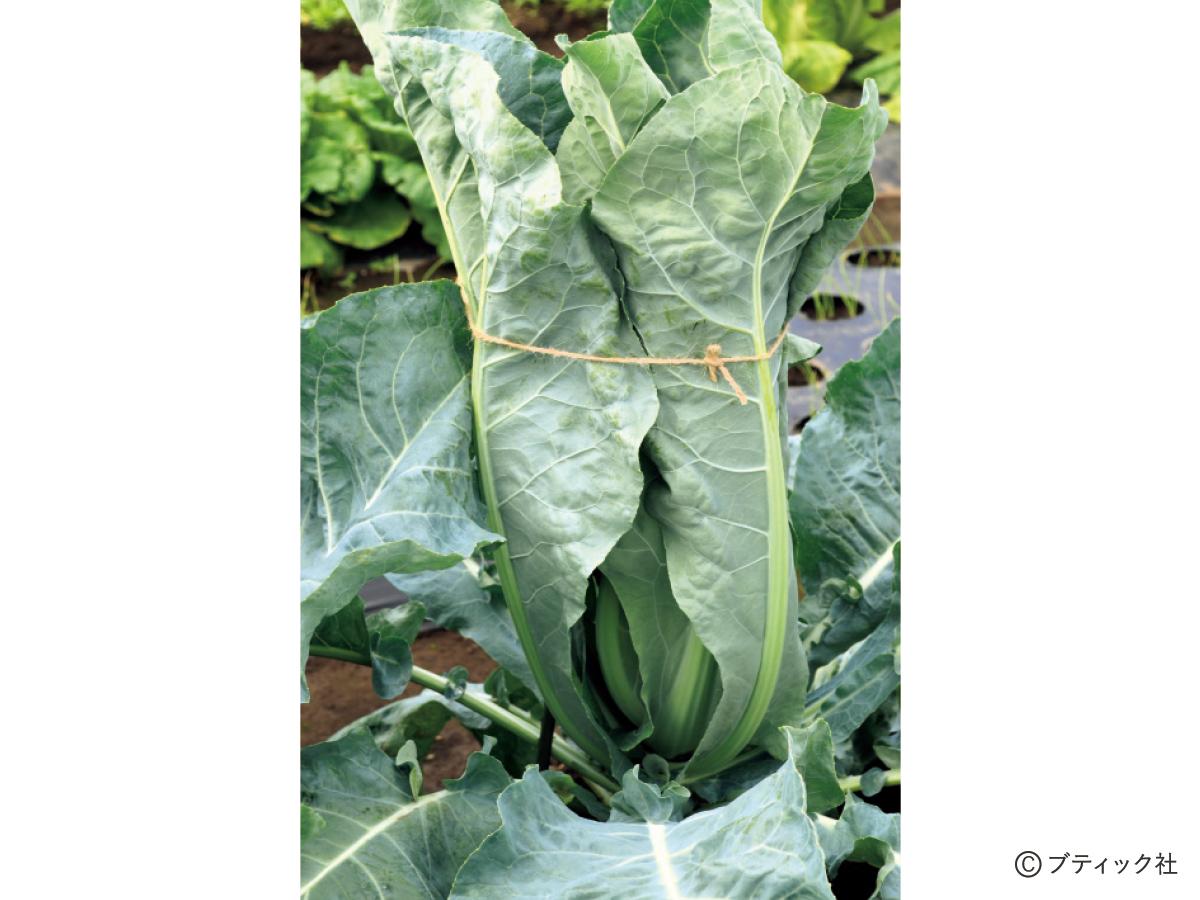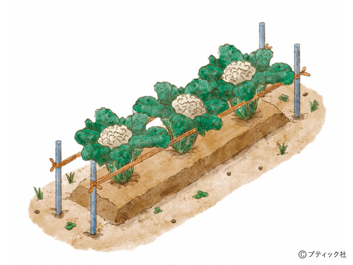 畝に杭を立ててヒモを2本張り、カリフラワーやブロッコリーの葉を挟んで垂直気味に立てる方法もあります。株数が多い場合はこのやり方がおすすめです。