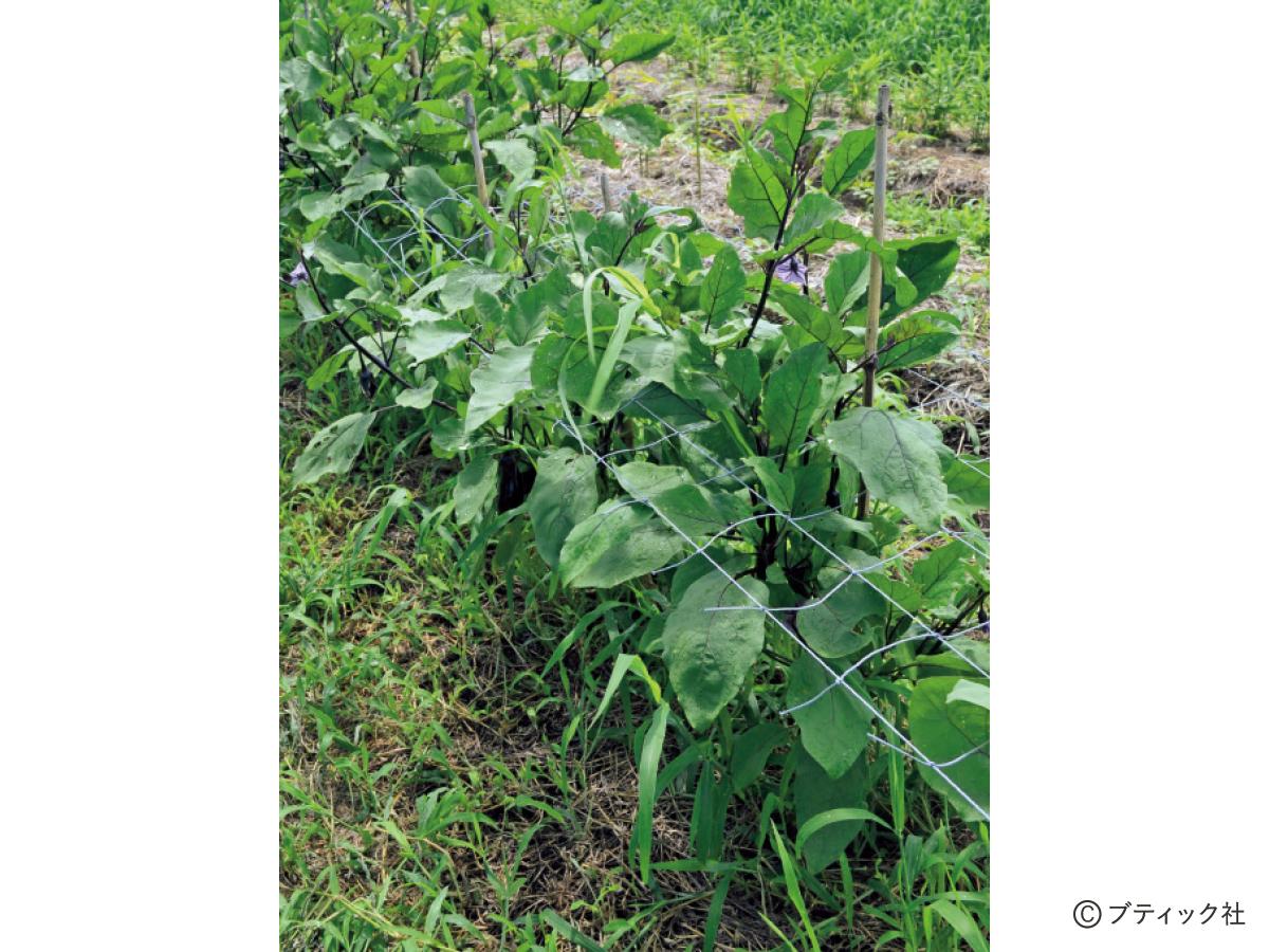 上は、ナスのフラワーネット栽培例。目合いに枝を通して支えます。ナスの生長に合わせ、ネット全体を上にずらします。