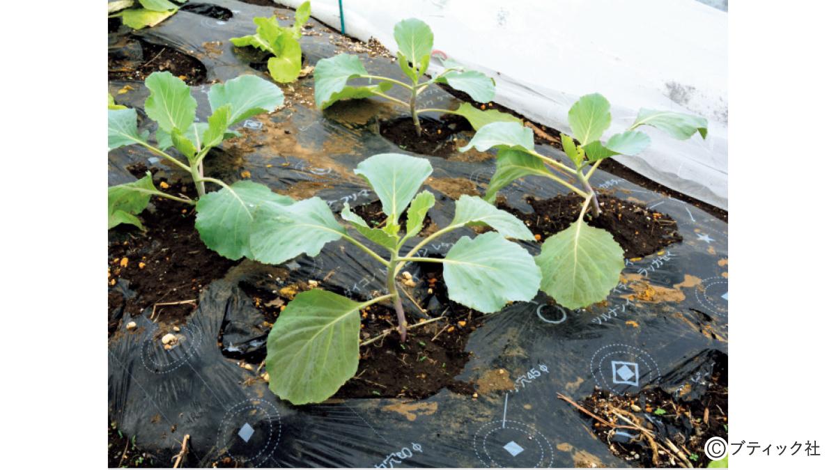 キャベツの苗を植える時期は、中間地では9月上旬~中旬が目安です。ブロッコリー同様、堆肥や肥料を入れずに、土を耕して畝をつくり、マルチを張っておきましょう。