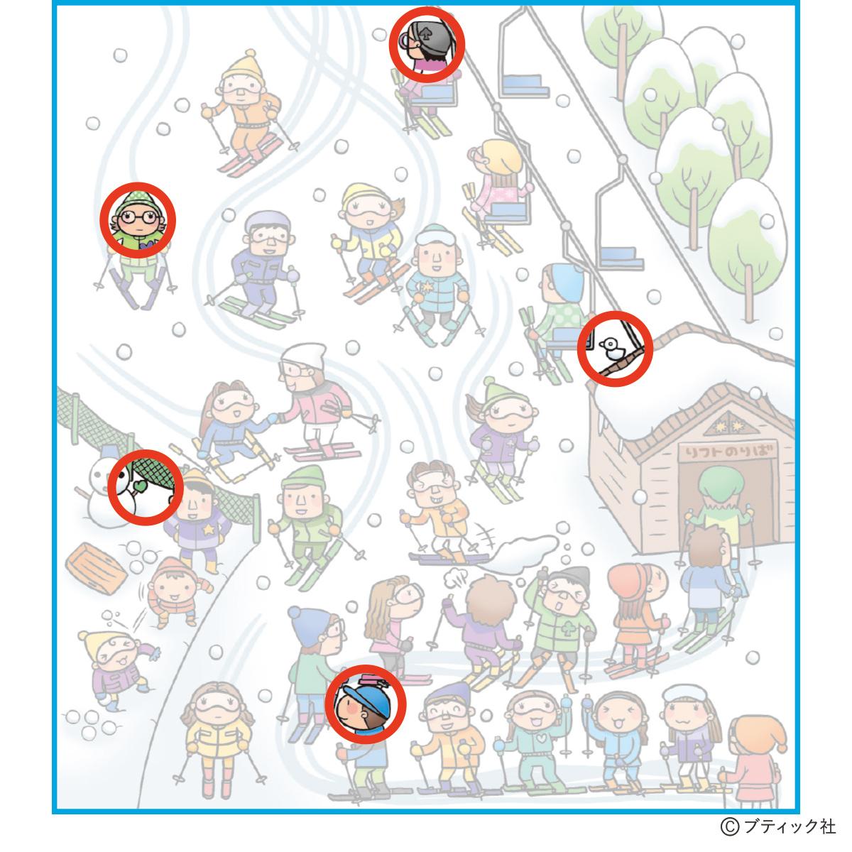冬のアクティビティといえばスキー!ゲレンデにはカラフルなウェアを着た人たちが集まりました。「さがすもの」の5つのイラストを、大きな絵の中から見つけて、○で囲んでください。