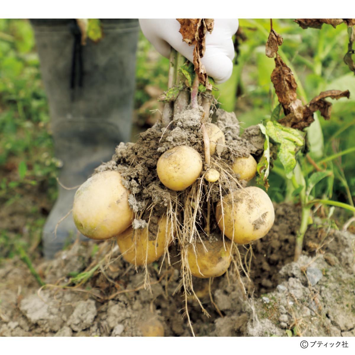 さて、ジャガイモは葉が枯れだしたら収穫のサインです。天気のいい日が3日くらい続いて、土が乾き気味のときに掘り出しましょう。まずは、おいしい新ジャガを味わいましょう。