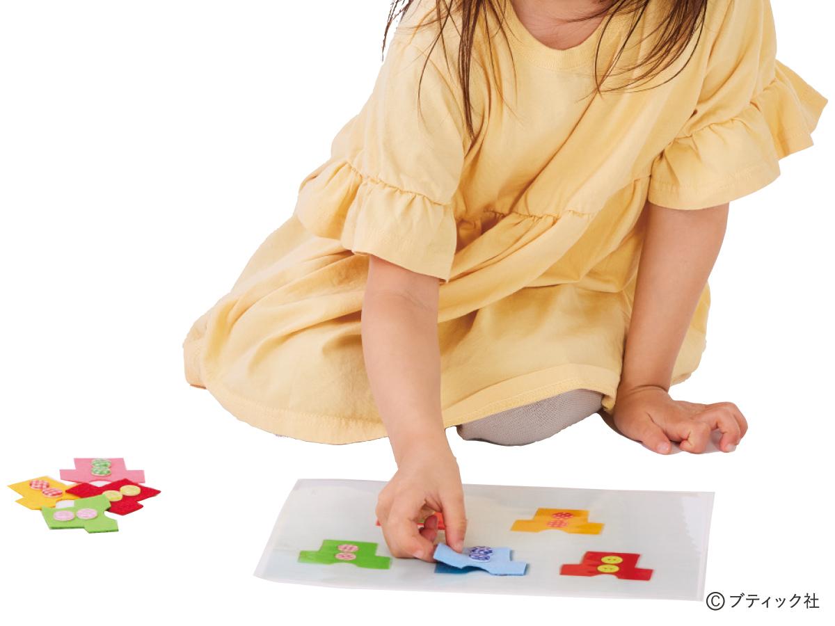 発達おもちゃの作り方と遊び方を紹介する本の中から、色や形を認識し理解できる「認知」に関するおもちゃをピックアップ!見本の服と同じ模様のフェルトの服を見つけて、見本の上に置いていく遊びです。