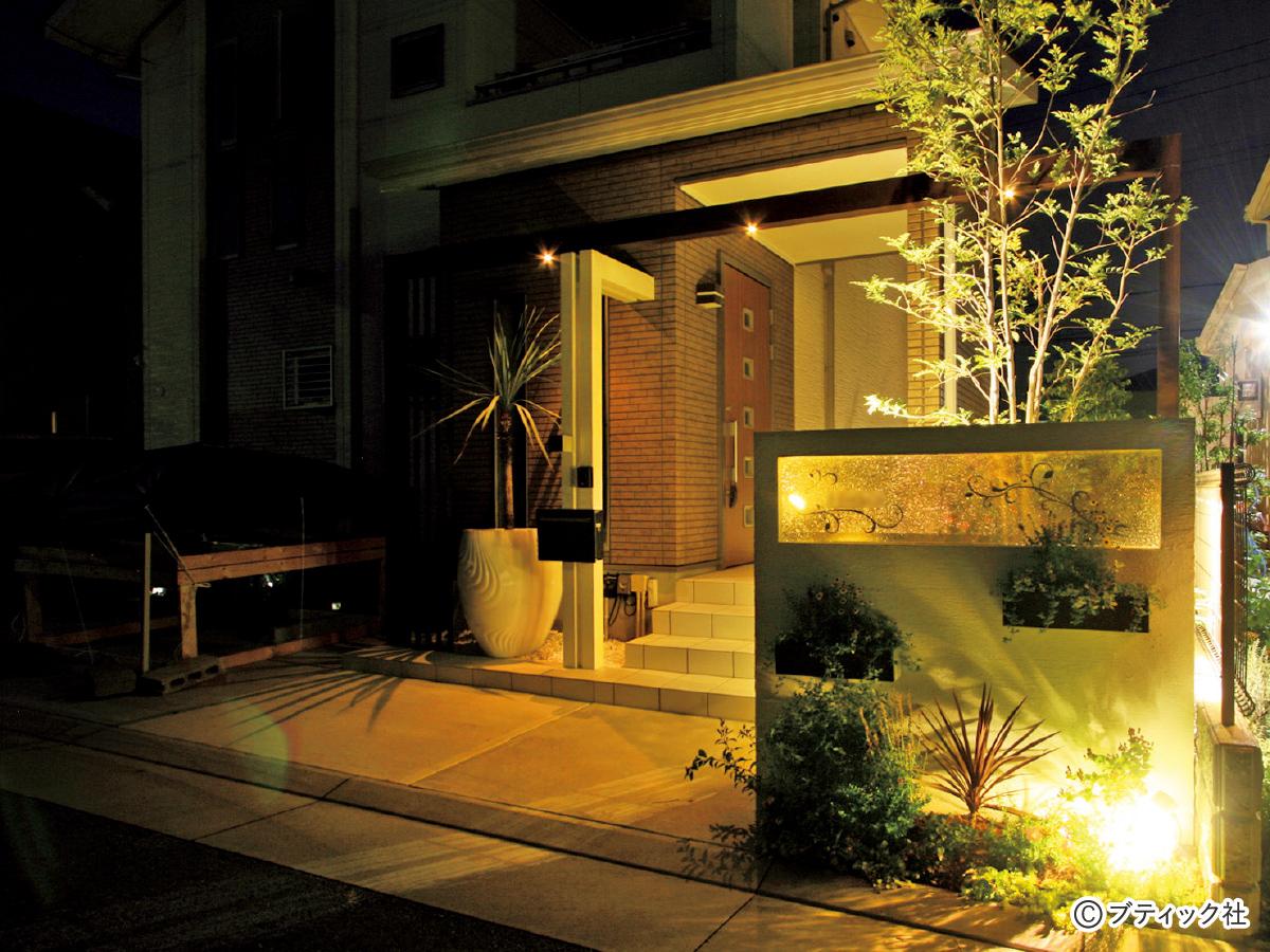 夜景。昼間とはまたちがった表情の外観。ゲートに組み込んだダウンライトと門柱や植木を照らすスポットライトが、門まわりをあたたかくゴージャスにライトアップします。