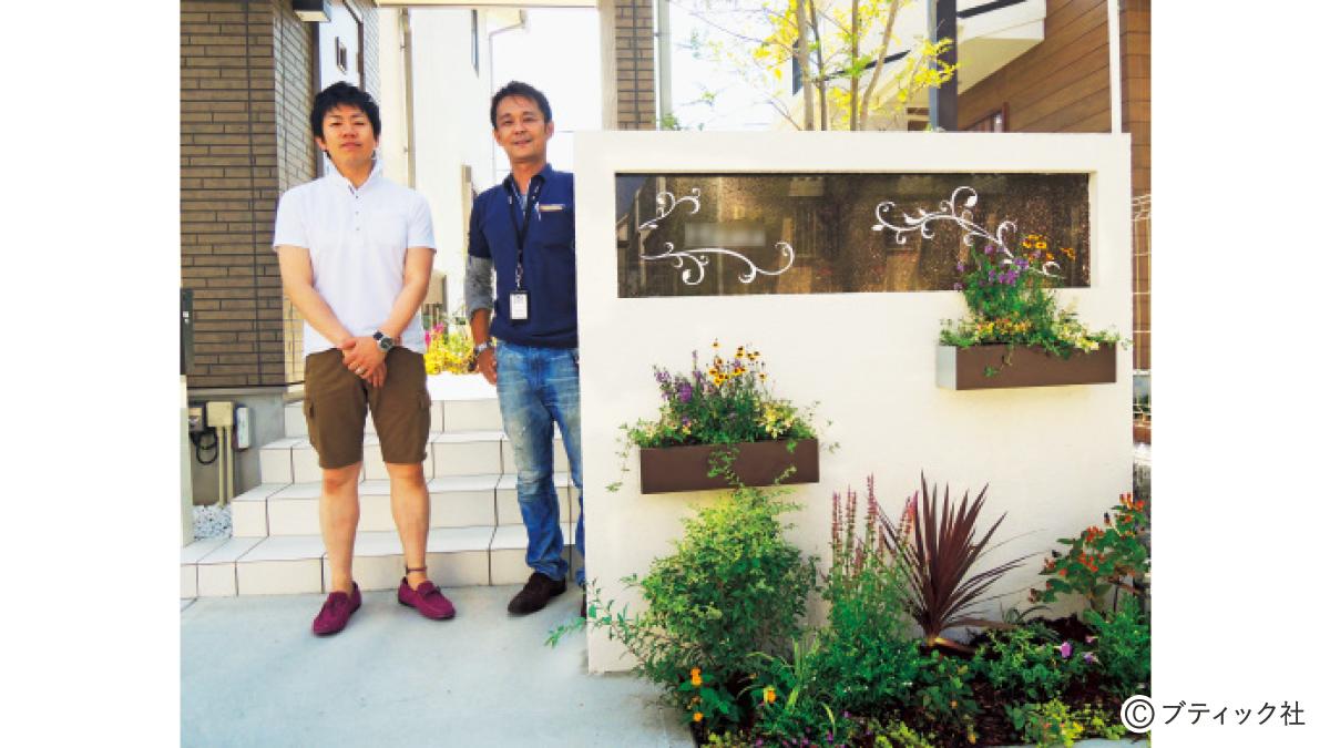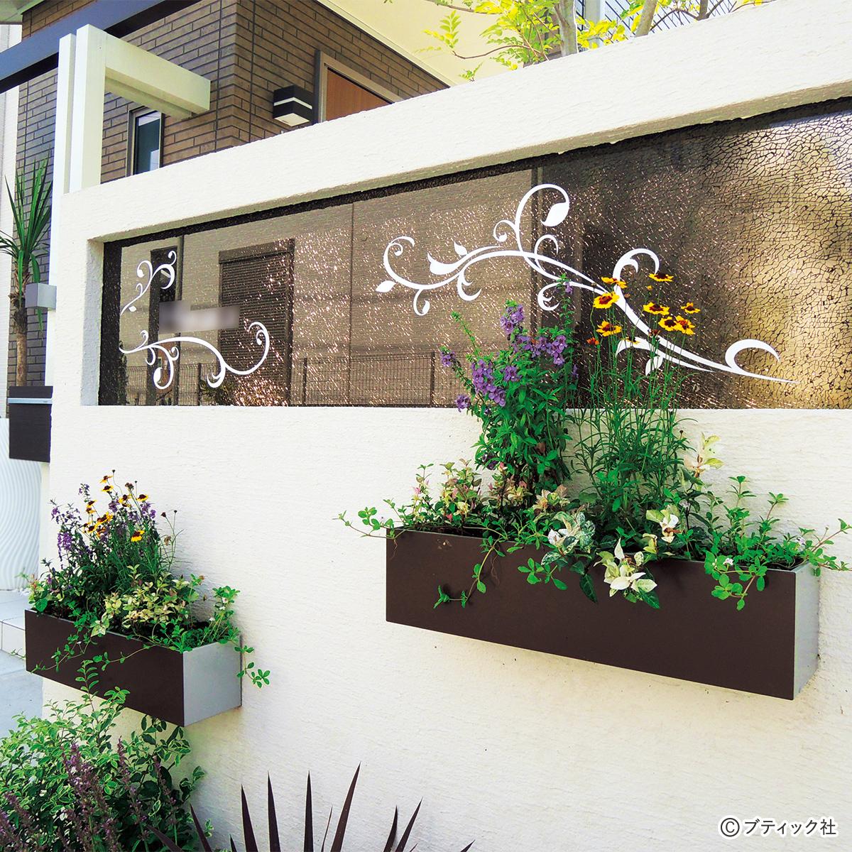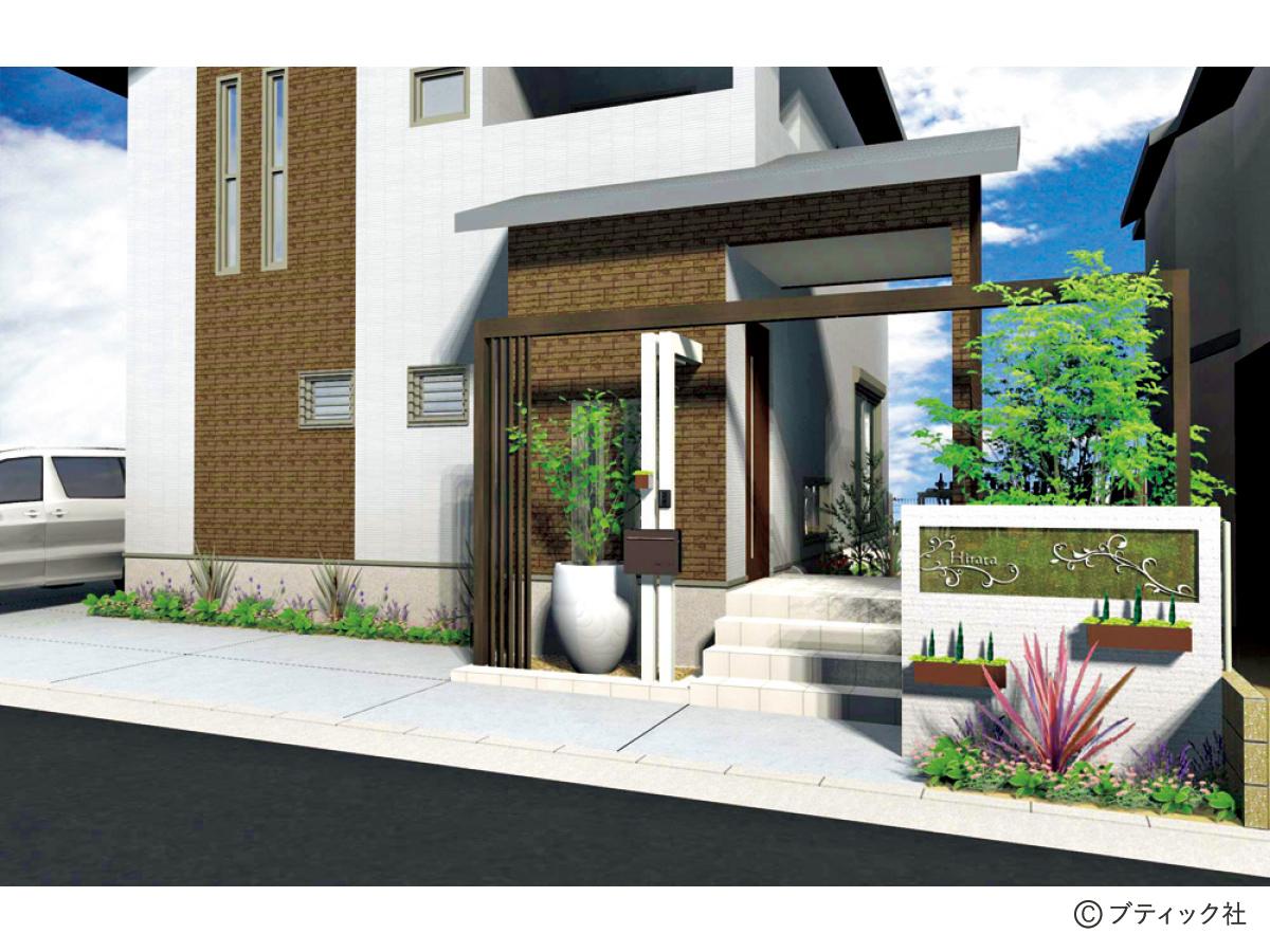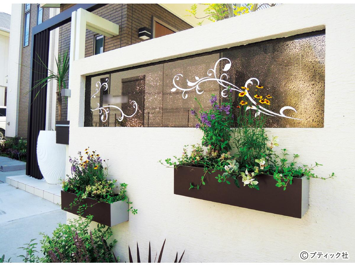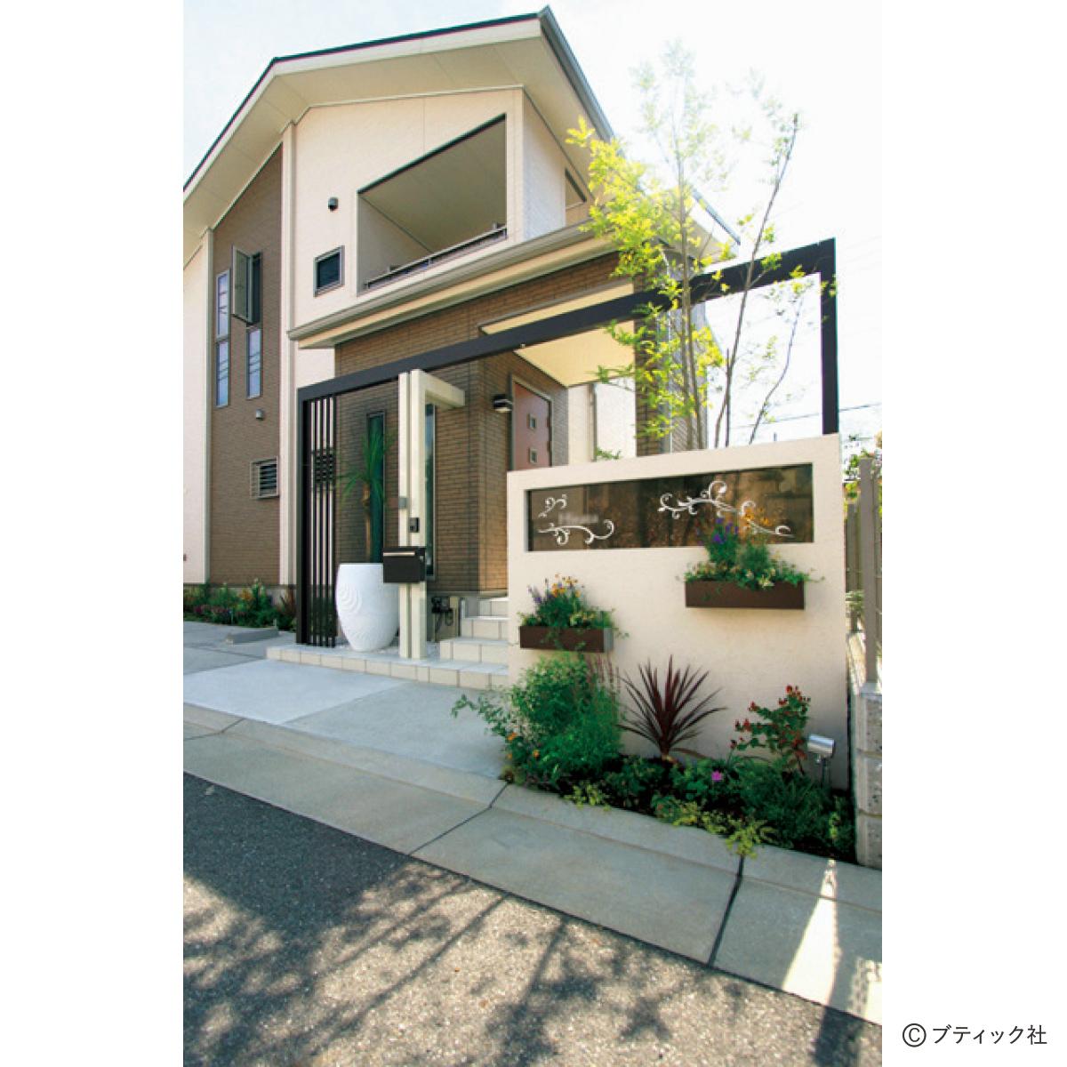 ガラスの下にはおしゃれな壁掛けプランターを設置。季節のお花が門まわりを美しく演出します。  アプローチ上にはゲートを組み、より奥行感を演出。濃い木目のフレームにはダウンライトを仕込み、夜もお楽しみいただけます。格子は玄関の窓の目隠しの役割も果たします。