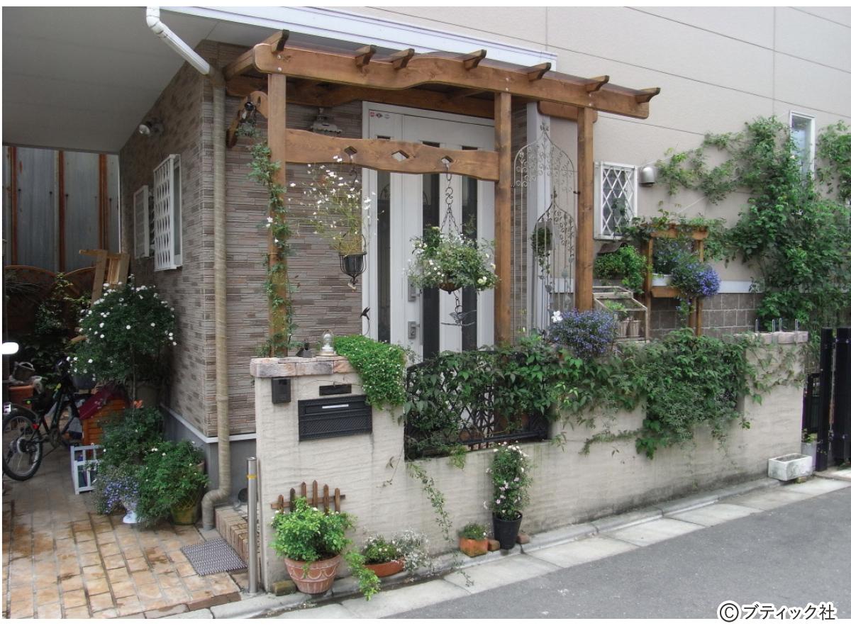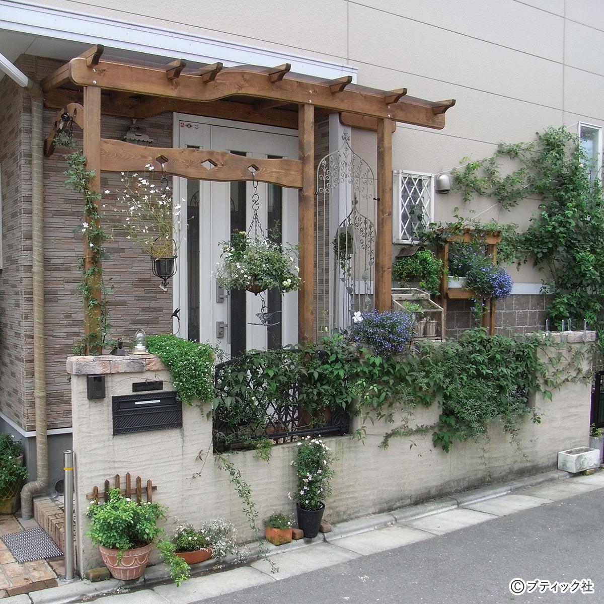 花いっぱいの玄関まわり。オリジナルの木製パーゴラをつくり、アイアン(鉄)製のフェンスをつけてハンギングバスケットや鉢花を飾れるように。