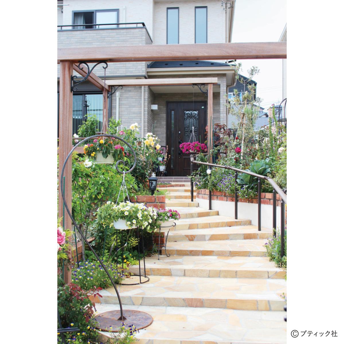 アプローチの両側に植栽スペースを設けてバラを植え、アーチやフラワースタンドにハンギングバスケットを掛けて華やかに。