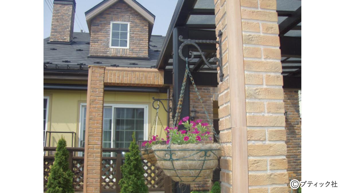 カーポートの柱にハンギングバスケットを掛けて華やかに。