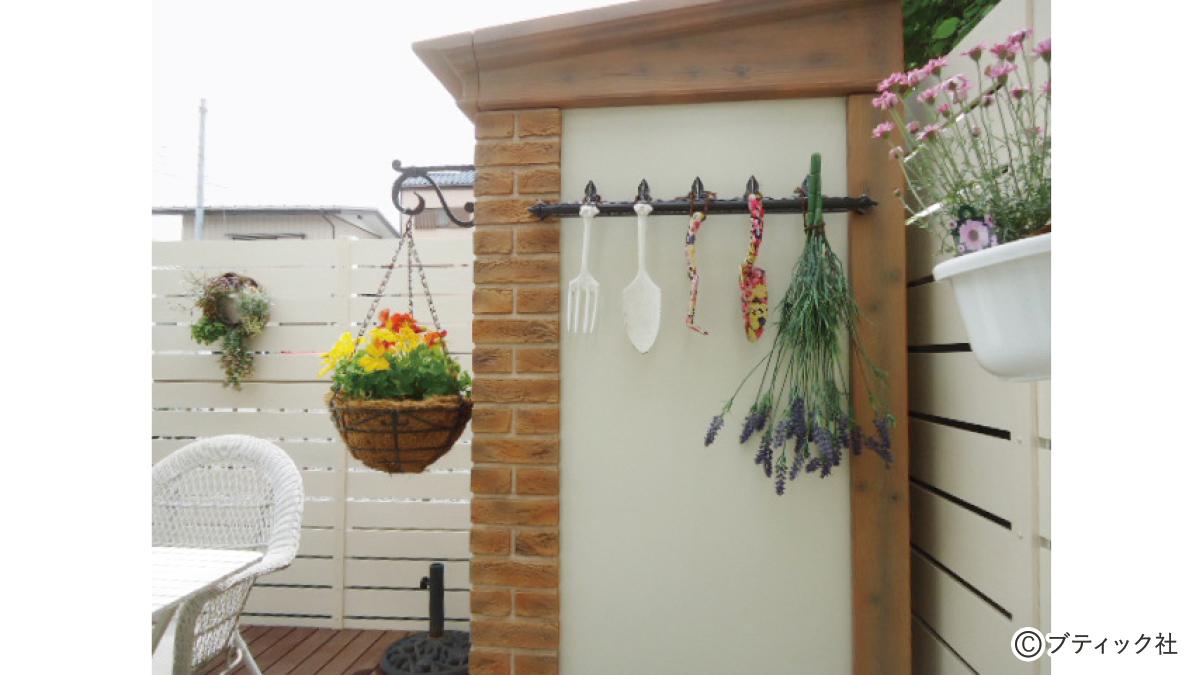 FRP(繊維強化樹脂)製のおしゃれな物置。専用の金具でハンギングバスケットやガーデングッズが掛けられます。