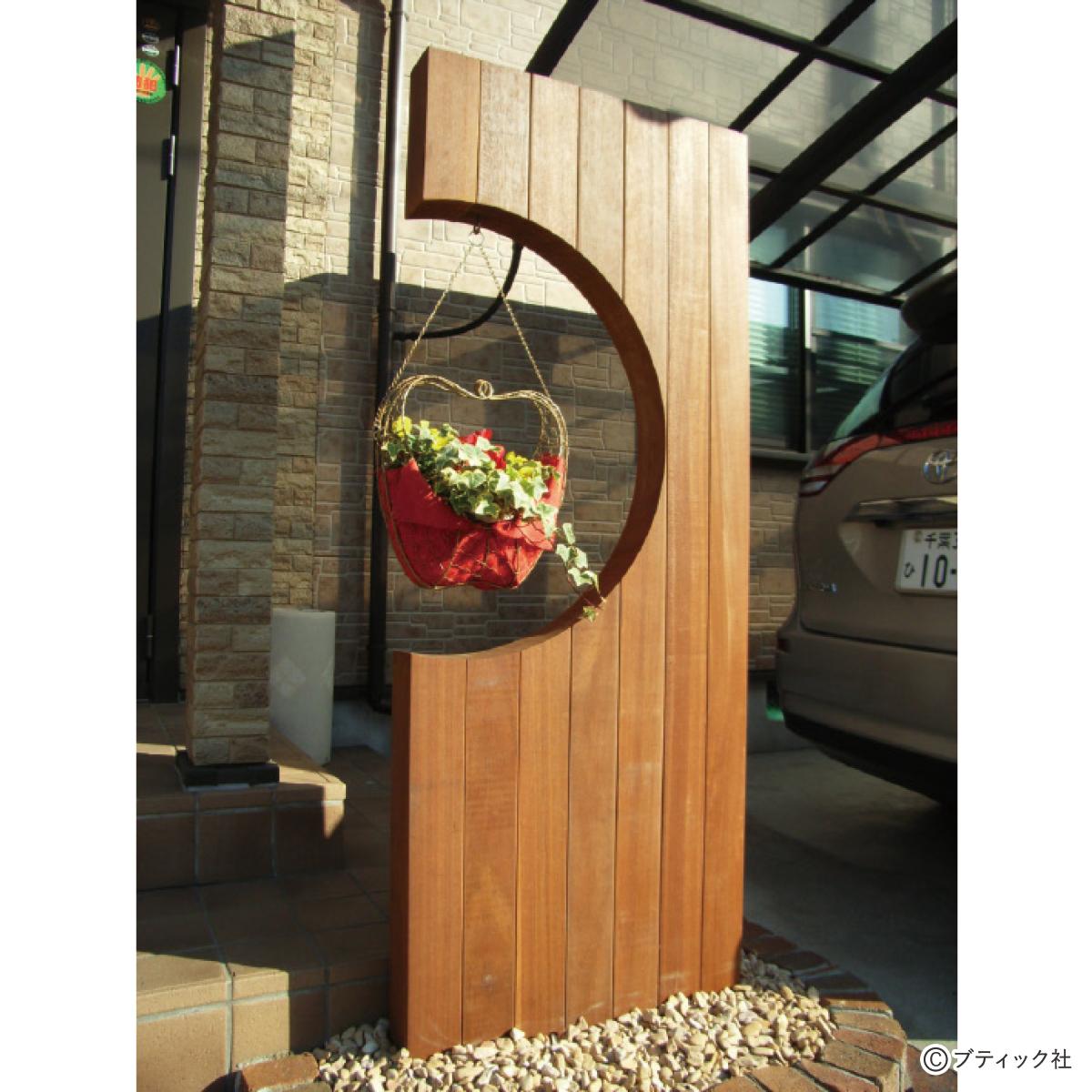 アイアンウッド(鉄のように硬い木材)の門袖をR(曲線)にくり抜き、鉢植えの花やハン