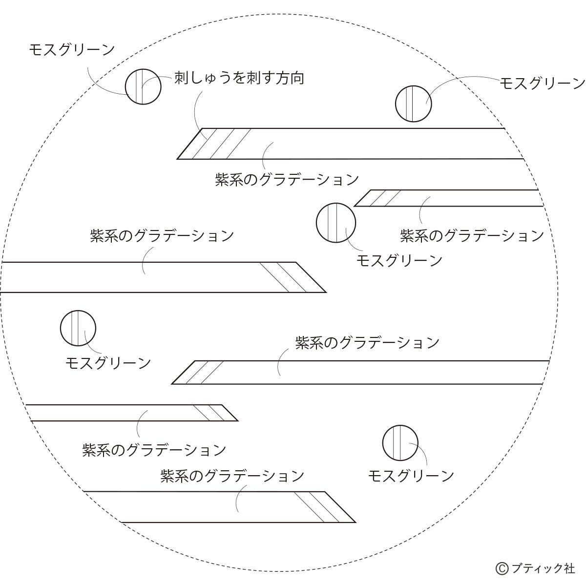 モスグリーンは円の中心から両端に向かって刺し、紫系のグラデーションは端から刺し始めます。