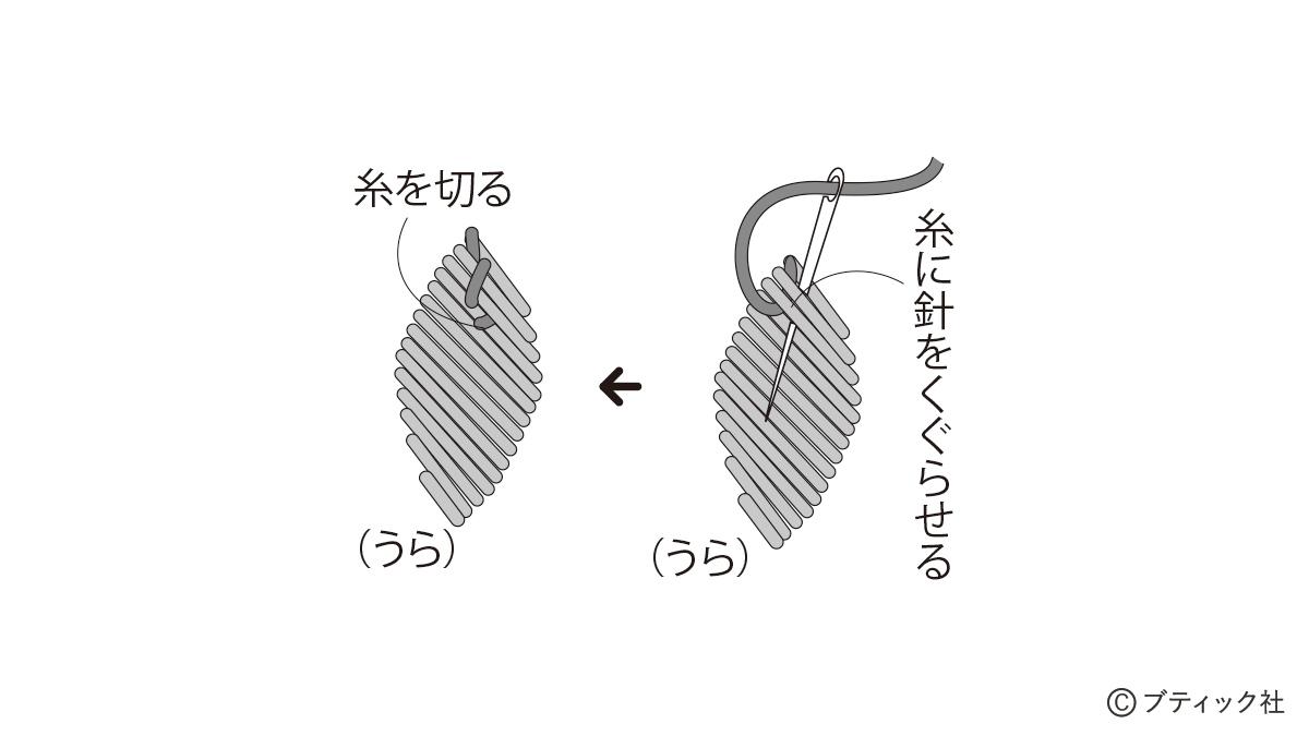 布のうら側に針を出し、裏側に出ている糸に針をくぐらせて、刺し終わりの糸を巻き付けます。2回ほど針をくぐらせて、糸を切ります。