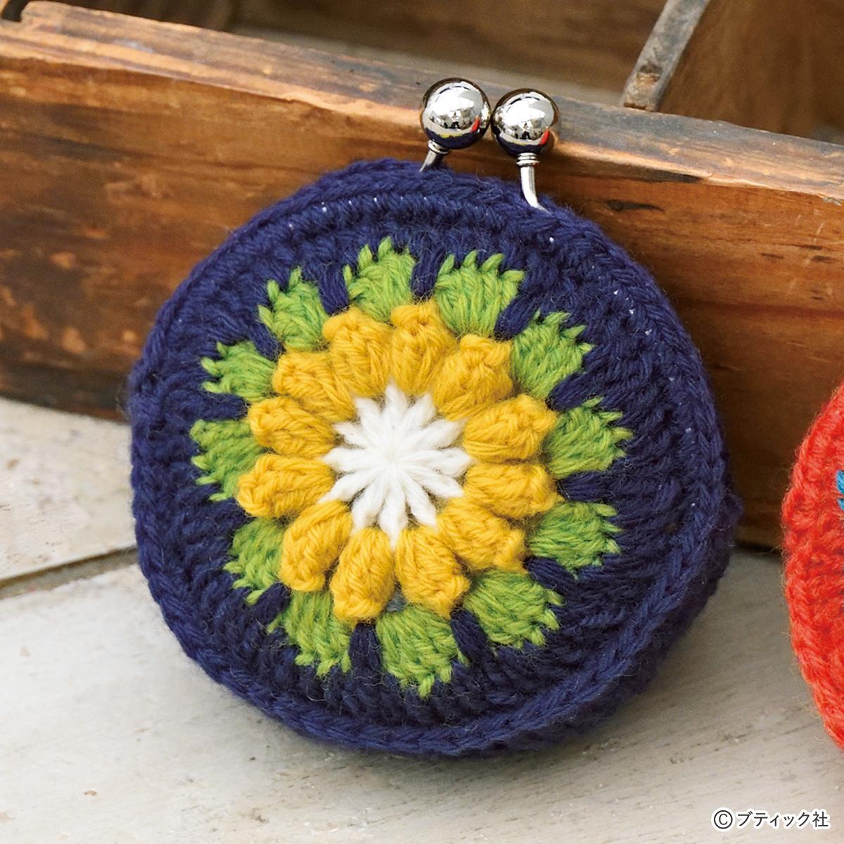 04 モチーフとまちから目を拾い、指定の位置で口金を編みくるみながら縁編みを編みます。