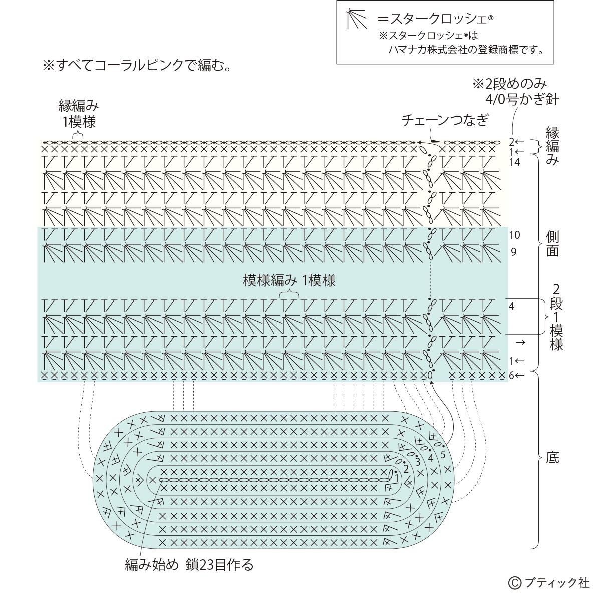 02 続けて、模様編み、縁編みで側面を輪に編みます。