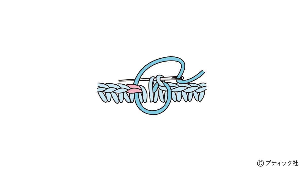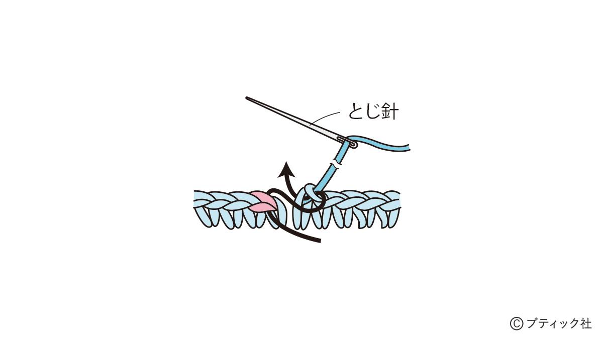 02 糸端をとじ針に通し、矢印のように編み始めの目に入れてから編み終わりの目に戻します。
